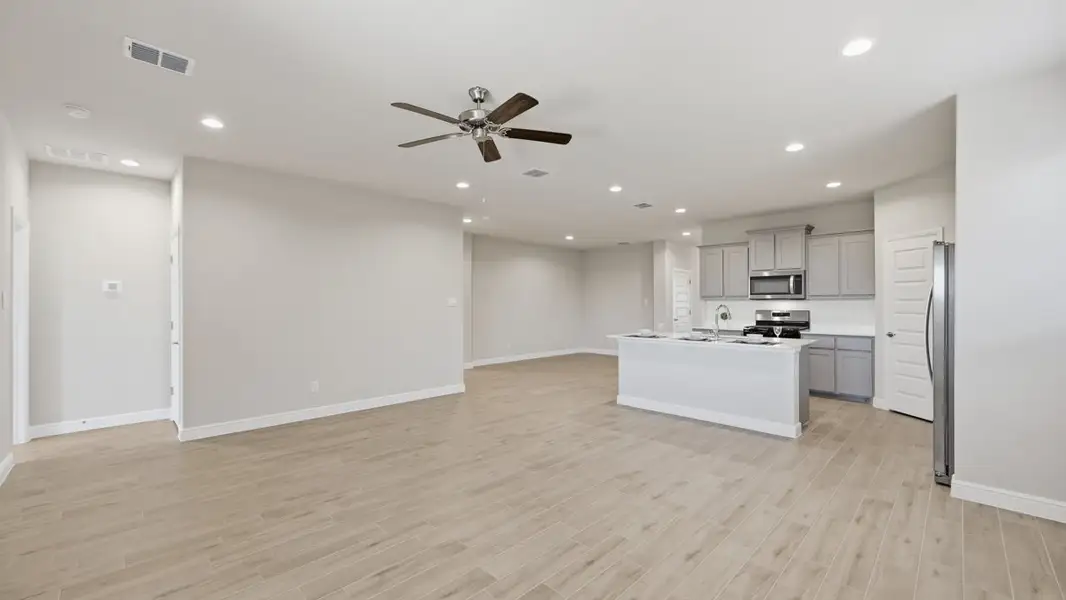 The Las Cruces is a spacious single-story home offering approximately 2,120 sq. ft. of living space with 5 bedrooms, 3 bathrooms, and a 2-car garage, designed to accommodate a variety of living needs with comfort and functionality. A welcoming front porch opens into a defined foyer that leads into an open-concept main living area where the kitchen, dining room, and expansive family room connect seamlessly, creating a bright and inviting space ideal for everyday living and entertaining. The kitchen features stainless steel appliances, ample counter space, a centrally located island with sink overlooking the family room, and a walk-in pantry for added storage. The adjacent dining area flows naturally into the family room and provides access to the covered rear patio, extending the living space outdoors. The private primary suite is positioned at the rear of the home and includes a spacious bedroom, walk-in closet, and a full bath with linen storage. Secondary bedrooms are thoughtfully distributed throughout the home, including additional bedrooms with nearby full bathrooms that provide flexibility for guests, multigenerational living, or a home office setup. A dedicated laundry room and direct access to the two-car garage enhance everyday convenience. With its generous bedroom count, open living areas, and covered outdoor space, the Las Cruces offers flexible and comfortable living for a wide range of lifestyles.