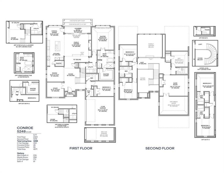 Popular open concept home features a dramatic two-story entry and family room with a fireplace. The two-story family room showcases a wall of windows that provides an abundance of natural light. Nail-down wood floors flow through the main living spaces, while plush carpeting adds warmth to the bedrooms and media room. The beautiful gourmet kitchen offers quartz countertops, upgraded built-in appliances, and a large walk-in pantry. The spacious primary retreat includes a generously sized bathroom with a beautiful freestanding tub, separate shower, and separate sinks and countertops. The primary bedroom, guest bedroom, and study are all located on the first floor. Upstairs, the game room and media room are situated together, creating an ideal entertainment space. Additional upgrades include box windows in the primary bedroom, family room, and game room. A covered back patio provides an inviting outdoor entertainment space.