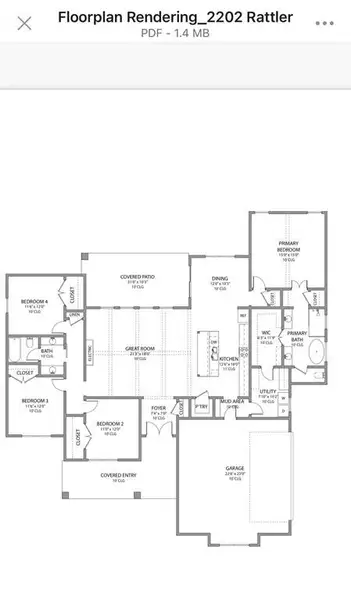 The primary suite is privately tucked away and offers a peaceful retreat with a spacious bedroom, dual vanities, soaking tub, separate shower, and a walk-in closet that connects conveniently to the utility room. On the opposite side of the home, three additional bedrooms share a well-appointed bathroom, creating a functional layout for guests or flexible use.