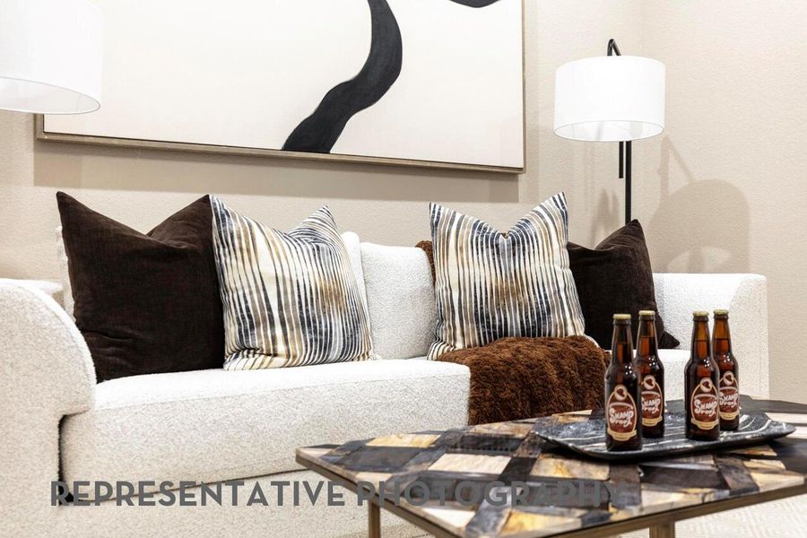 This spacious home features an open-concept living area filled with natural light, a stylish fireplace, and a dedicated home office. The gourmet kitchen flows seamlessly into the living and dining spaces, perfect for entertaining. The downstairs media room offers an ideal space for movie nights, while the upstairs game room provides additional room for recreation and relaxation. The luxurious primary bathroom features a freestanding tub, creating a spa-like retreat. Step outside to a covered extended patio overlooking serene lake views, with no back neighbors for maximum privacy. A 3-car tandem garage provides ample storage and parking. With 5 bedrooms and 5.5 baths, this home is designed for comfort, function, and style.