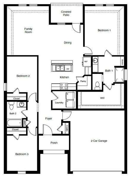 The Dove is a thoughtfully designed single-story home offering approximately 1,587 sq. ft. of living space with 3 bedrooms, 2 bathrooms, and a 2-car garage. A welcoming front porch opens into a defined foyer that leads into an open-concept layout where the kitchen, dining area, and family room come together in one bright, connected living space—ideal for both everyday living and entertaining. The kitchen features stainless steel appliances, generous counter space, a centrally located island overlooking the family room, and a walk-in pantry for added storage. The adjacent dining area flows seamlessly into the spacious family room, which provides access to the covered rear patio for easy indoor-outdoor living. The private primary suite is located toward the rear of the home and includes a large bedroom, a walk-in closet, and a full ensuite bath. Two additional bedrooms are positioned along the opposite side of the home, each with its own closet and convenient access to the secondary bathroom—perfect for guests, children, or a home office. A dedicated laundry room and direct access to the two-car garage add everyday convenience and functionality. With its open-concept living areas, split-bedroom layout, and covered outdoor space, the Dove offers comfort, efficiency, and flexibility for a variety of lifestyles.