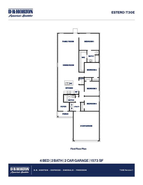 The Estero/T30E plan is a charming single-story home featured in the Lexington Heights community. Featuring two classic front exteriors, this four-bedroom, two-bathroom home also offers 1573 square feet of living space and a two-car garage.