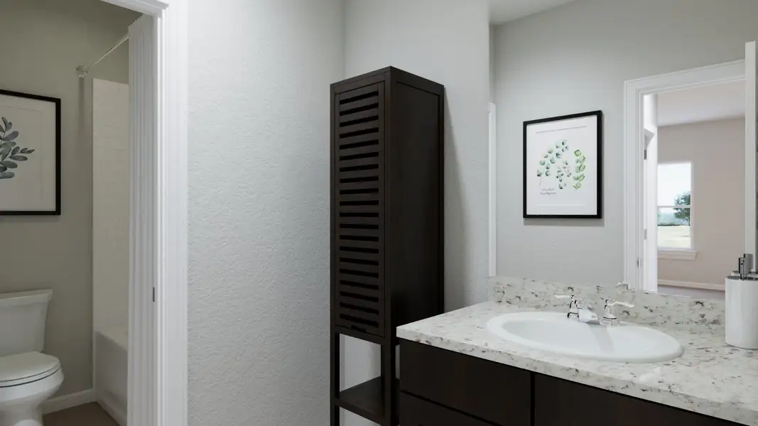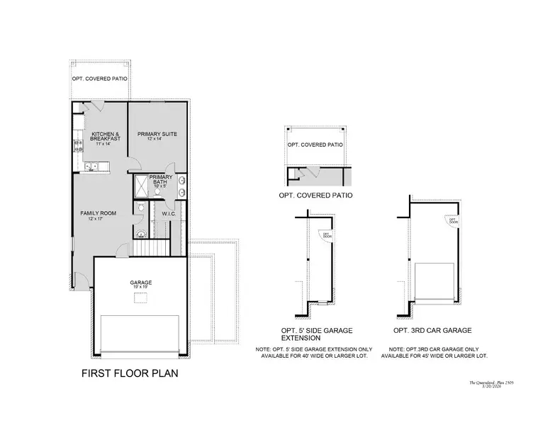The Queensland plan is a 2-story home with 4 bedrooms, 2.5 baths, and features a 1st floor primary suite as well as a 2nd floor flex space.