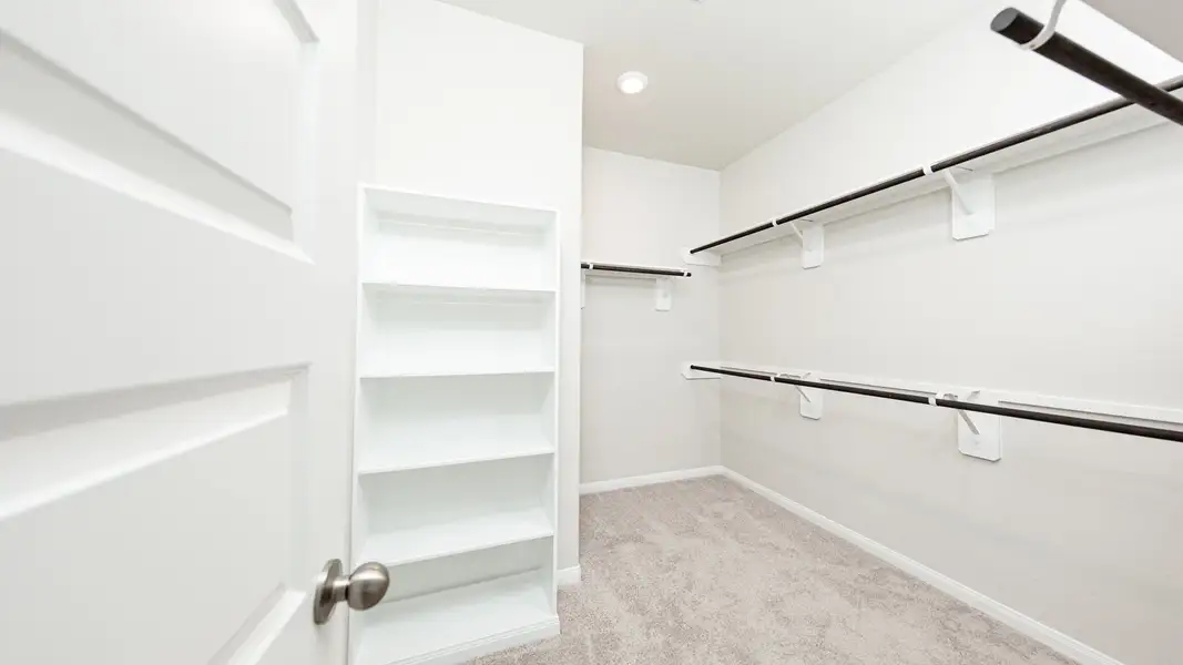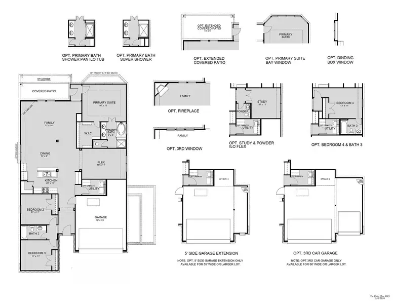 The Kirby plan is an efficiently designed 1-story home with 3 bedrooms, 2.5 bathrooms, and an open-concept living, dining, and kitchen area. This floorplan features a covered patio, an oversized pantry, a kitchen island with bar seating, a large family room, and a 2-car garage. The primary suite includes a walk-in closet with ample space connected to a private bathroom. The Kirby also features a dedicated laundry room and a flex space ideal for an office, playroom, or nursery.