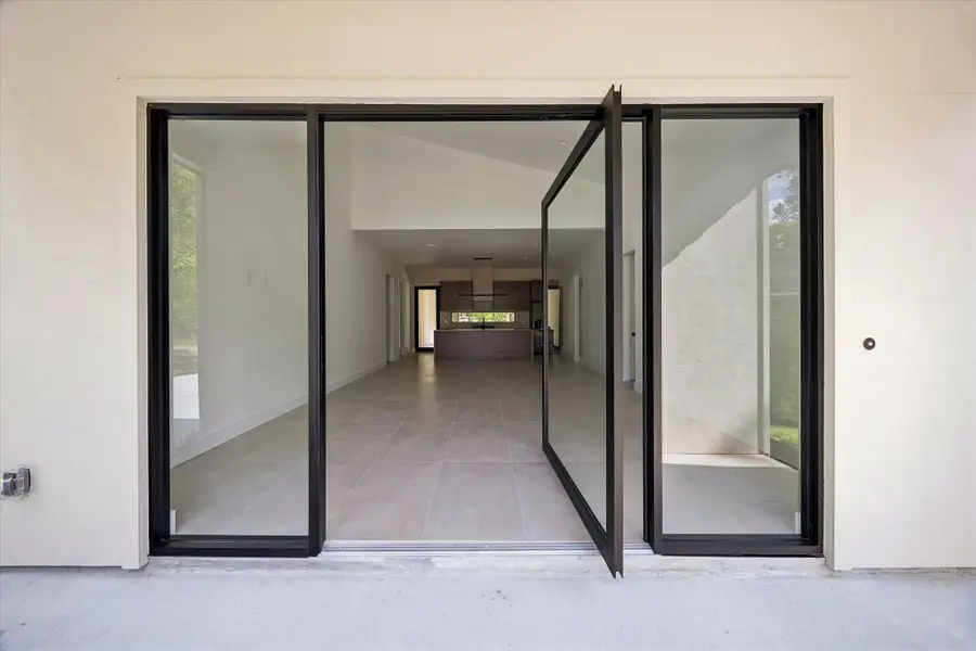 This stunning modern 4-bedroom, 3-bath home offers a seamless blend of luxury, space, and privacy, set on a large lot with a wooded backyard and no rear neighbors. A striking oversized pivot door creates a bold first impression, opening into a light-filled interior with soaring ceilings in the living room and an open-concept design built for both everyday living and entertaining. At the heart of the home, the kitchen features sleek Dekton porcelain countertops, a massive island, and a layout that flows effortlessly into the living area. The primary suite is a true retreat, complete with a spa-inspired bathroom showcasing a walk-in shower with dual shower heads. Both the primary and a guest bedroom feature sliding glass doors that open to the backyard deck, creating a seamless indoor-outdoor connection. Step outside to a covered patio overlooking the expansive, private backyard—perfect for relaxing or entertaining.