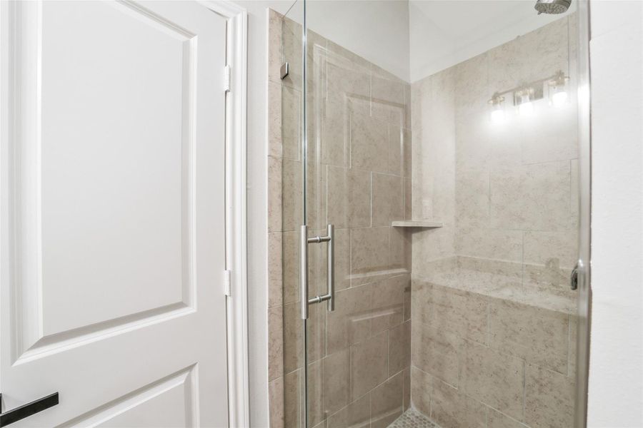 The main level offers a luxurious primary suite with a private en-suite bath, along with a secondary bedroom and full bath—ideal for guests or multi-generational living. Upstairs, you’ll find two additional spacious bedrooms. Wood-look tile flooring runs throughout the entire home—completely carpet-free—complemented by a striking hardwood staircase with wrought iron railings.
