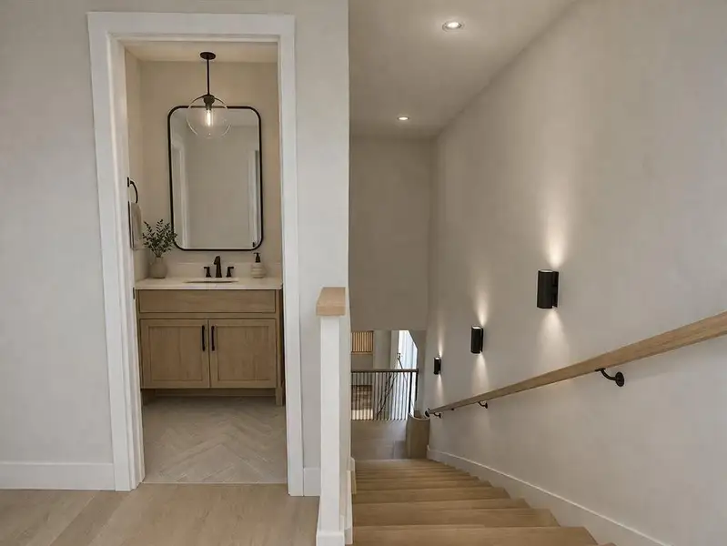 The second floor features a striking catwalk that spans the open living space below. This architectural bridge provides a sleek physical separation between the expansive primary suite and the two additional guest bedrooms. The experience culminates on the third-floor entertainment level, featuring a guest powder, 580 sqft rooftop terrace with spectacular skyline views.
