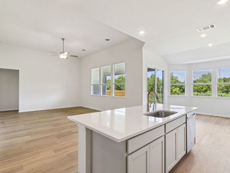 Enjoy movie dates in the second-story game or media room. Linen cabinets with marble-look white quartz countertops, warm beige laminate flooring, and multi-tone taupe carpet in our Divine package.
