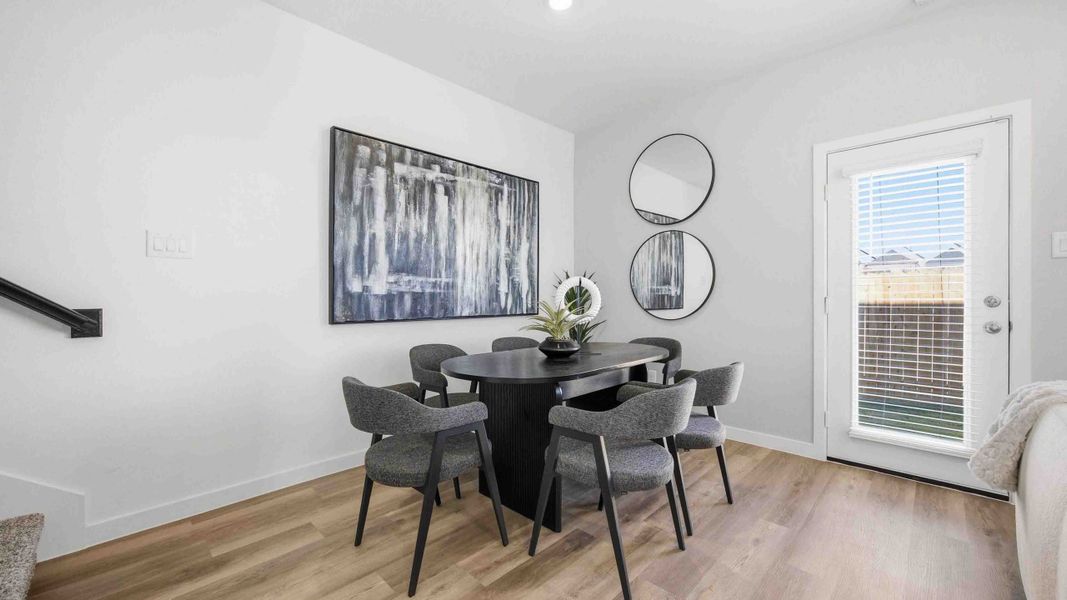 Welcome to the Hibiscus floor plan, a spacious two-story home that spans 1,483 square feet and includes a two-car garage. As you step inside, you'll be greeted by a charming front foyer that leads into the open-concept dining, living, and kitchen area, creating a welcoming and functional space for family gatherings and entertaining. The kitchen features a large island that offers additional storage and seating, making it a perfect hub for meal preparation and casual dining.