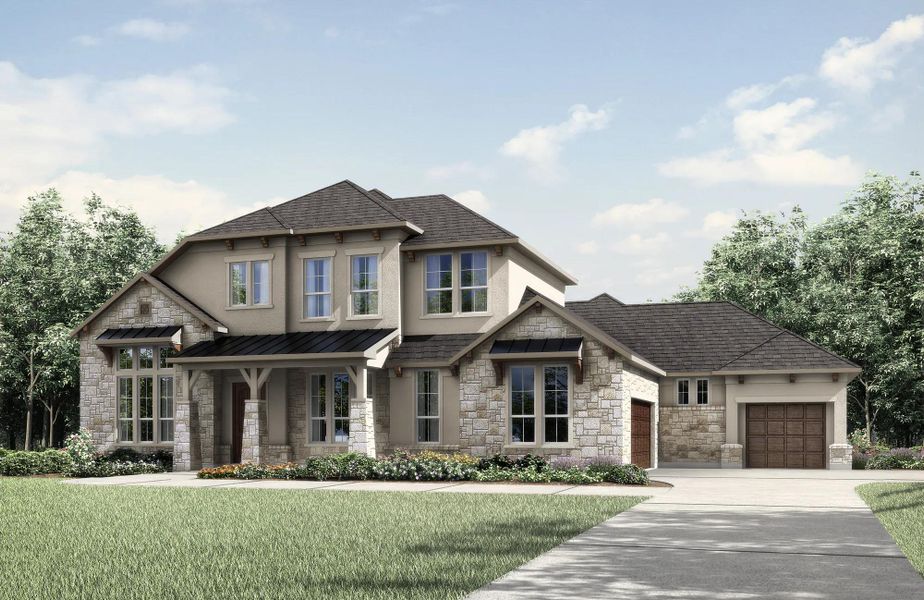 New 5 Bedroom/ 4.5 Bath home in Dripping Springs, TX! High ceilings, arches and niches characterize the Colinas II, lending it a graceful elegance. From the foyer you pass a formal dining room and a spacious home office, a perfect arrangement for entertaining clients or guests. An expansive family room is matched by the trendy outdoor living area, each having a cozy fireplace. The deluxe gourmet kitchen features a brilliant working pantry connecting to the dining room as well as an ample serving island, walk-in pantry, and light-filled breakfast room. The combination of the laundry room and family foyer makes a handy family ready room. Bedrooms flank this main-level living space: a second bedroom suite on one side, and on the other, the immense primary suite with its large walk-in closet and breathtaking luxury tub and glass shower pairing. Upstairs, there are three roomy bedrooms along with a gameroom and media space.