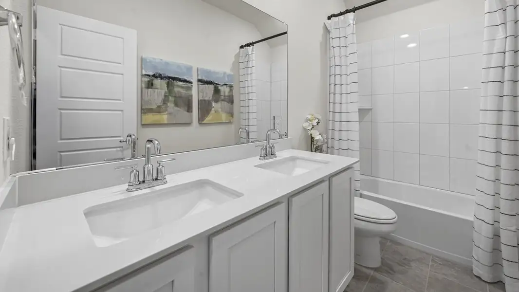 The large primary bedroom features an adjoined bathroom that will make getting ready in the mornings feel like a dream. The elongated vanity includes two sinks and a non-framed mirror. The primary bathroom also includes a walk-in shower and walk-in closet.