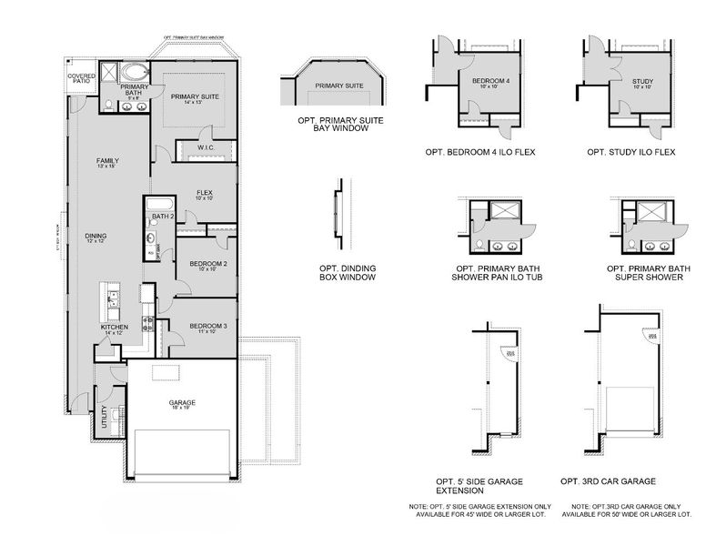 The Wildflower plan is a 1-story home with 3 bedrooms, 2 baths, and includes a covered patio, flex space, and kitchen island.