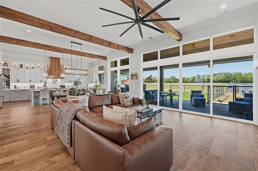 Exceptional modern farmhouse on 5 beautiful acres in a quiet yet convenient Savoy location. Thoughtfully designed for everyday living and elevated entertaining, this property offers approximately 4,480 square feet of total living area, including approximately 3,056 square feet in the main home, a 624 square foot guest casita, and an 800 square foot custom studio. The main home blends warmth and sophistication with exposed wood beams, whitewashed shiplap accents, quartz countertops throughout, and rich earth-tone finishes. The chef’s kitchen is equipped with KitchenAid appliances, a six-burner gas range with double electric ovens, pot filler, wood-encased vent hood, butler’s pantry, and a large built-in wine rack. The stunning great room features a beamed ceiling, fireplace, and views of the outdoor living area. A separate billiards room adds additional space for relaxing or entertaining. The spacious owner’s suite overlooks the countryside and outdoor living area and includes a large walk-in closet, freestanding soaking tub, oversized walk-in shower, and separate vanities. The guest casita offers excellent flexibility with a full kitchen, spacious bedroom, living area, and accessibility-minded design. The custom studio includes a private office, full bath, music or media room, making it ideal for creative space, guest overflow, home business, or entertaining. Outdoor amenities are impressive with a covered living area featuring a built-in grill, refrigerator, storage, granite countertops, dining and seating areas, stained pine plank ceiling, and built-in speakers. A fenced artificial turf area provides mud-free play space for pets or kids, while the heated galvanized corrugated sheet pool and separate hot tub create a true backyard retreat. Additional features include smart home technology, built-in sound system, security cameras, Generac standby generator, four tankless water heaters, foam insulation, equipment barn and underground propane storage.