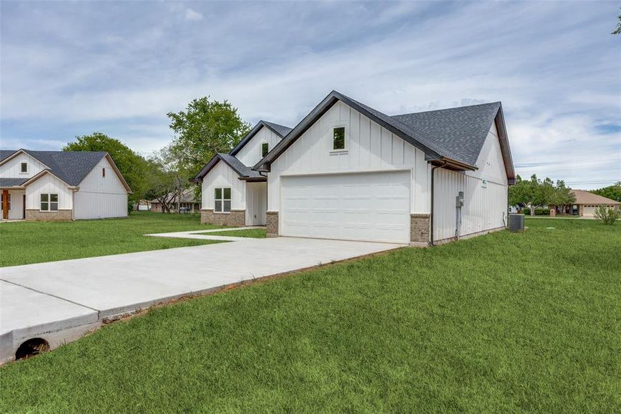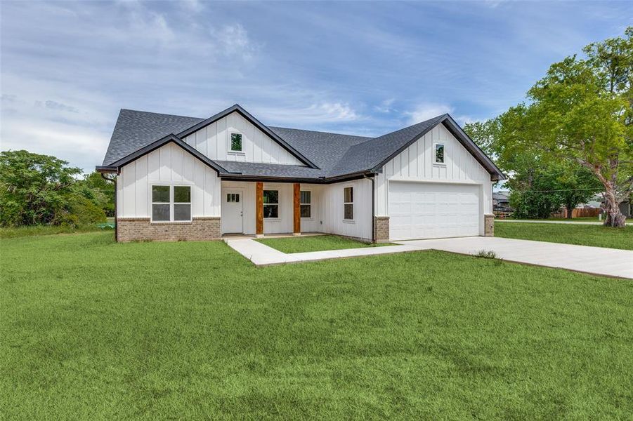 Welcome to this stunning new construction Modern Farmhouse! This thoughtfully designed 3-bedroom, 2-bath home offers an open-concept layout perfect for modern living. The chef-inspired kitchen features custom shaker cabinets, quartz countertops, subway tile backsplash, a large center island with pendant lighting, stainless sink with black pull-down faucet, and all black GE appliances including electric range, microwave, and dishwasher. A walk-through pantry provides generous storage. The spacious living room flows seamlessly into the dining area, ideal for entertaining. The primary suite boasts a tray ceiling with ceiling fan, walk-in closet, and private en-suite bath. Two additional bedrooms share a well-appointed full bath. The built-in mudroom with custom cabinetry and bench seating off the garage entry adds everyday functionality. Luxury vinyl plank flooring throughout main living areas with plush carpet in bedrooms. Attached 2-car garage. Board and batten siding with brick accents give this home standout curb appeal. Move-in ready!