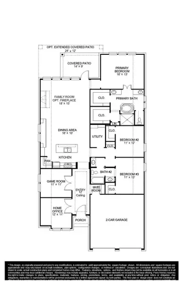 Entry framed by a home office and game room both with French door entry. Generous family room with a grand wall of windows and a wood mantel fireplace. Kitchen features an island with built-in seating space, a 5-burner gas cooktop, and a corner walk-in pantry. Secluded primary suite with three large windows. Primary bathroom features French door entry, dual vanities, garden tub, separate glass enclosed shower and dual walk-in closets. Secondary bedrooms with wall-in closets, a utility room and a Hollywood bathroom completes this design. Extended covered backyard patio. Mud room just off the two-car garage.