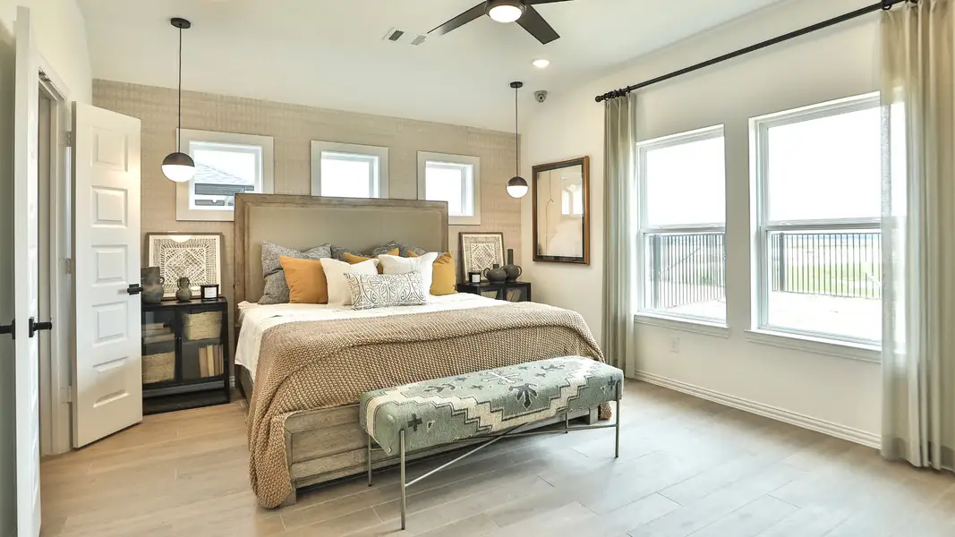 Step into this stunning former model home where elevated design and everyday livability come together in a bright, open layout built for both entertaining and relaxation. The main living areas flow seamlessly from the kitchen into the breakfast and family room, creating a connected space where gathering feels natural and effortless. At the center, the kitchen makes a statement with stainless steel appliances, including a gas cooktop, custom cabinetry, and striking two-toned countertops that add both visual interest and durability for daily use. Luxury wood-look tile flooring throughout the main areas provides a warm, high-end feel while standing up to everyday life, with soft carpet in the bedrooms for added comfort. The primary suite offers a private retreat designed to help you unwind, featuring a spacious shower, dual vanities that simplify busy mornings, and an expansive closet that keeps everything organized. Just beyond the living space, a covered patio overlooks a fully sodded yard with a built-in sprinkler system, creating an inviting outdoor setting for relaxing evenings or casual gatherings. Scheduled for a July 2026 move-in, this beautifully appointed home offers a rare opportunity to own a professionally designed space that blends style, comfort, and functionality.