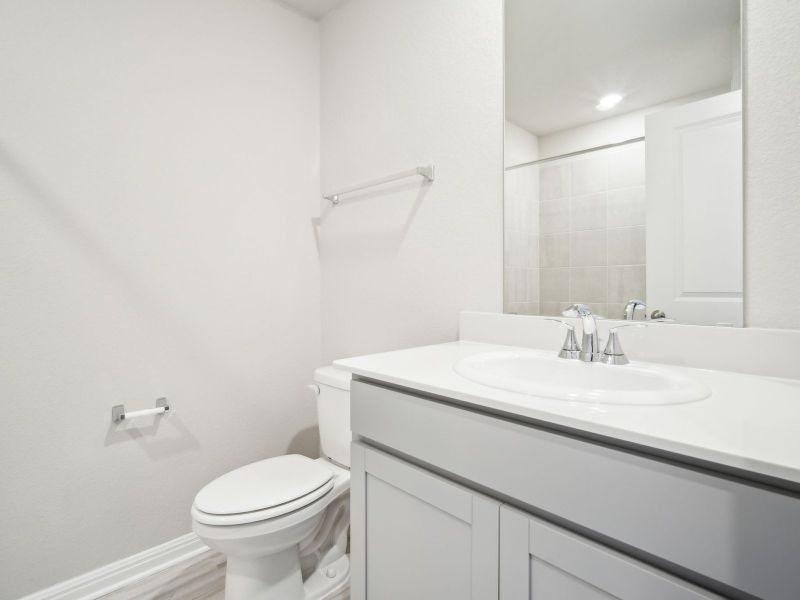 Live in luxury with the private primary suite at the back of the home in the Spade floorplan. Linen cabinets with black pearl granite countertops, warm beige EVP flooring, and warm multi-tone taupe carpet in our Chic package.