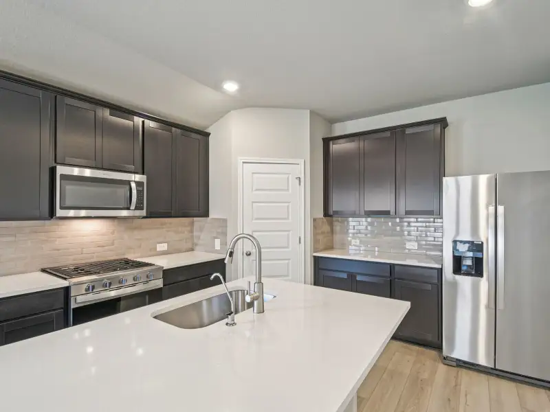 Clear sight lines from the kitchen through the great room bring everyone together. Gray cabinets with marble-look white quartz countertops, warm beige EVP flooring, and multi-tone taupe carpet in our Radiant package.