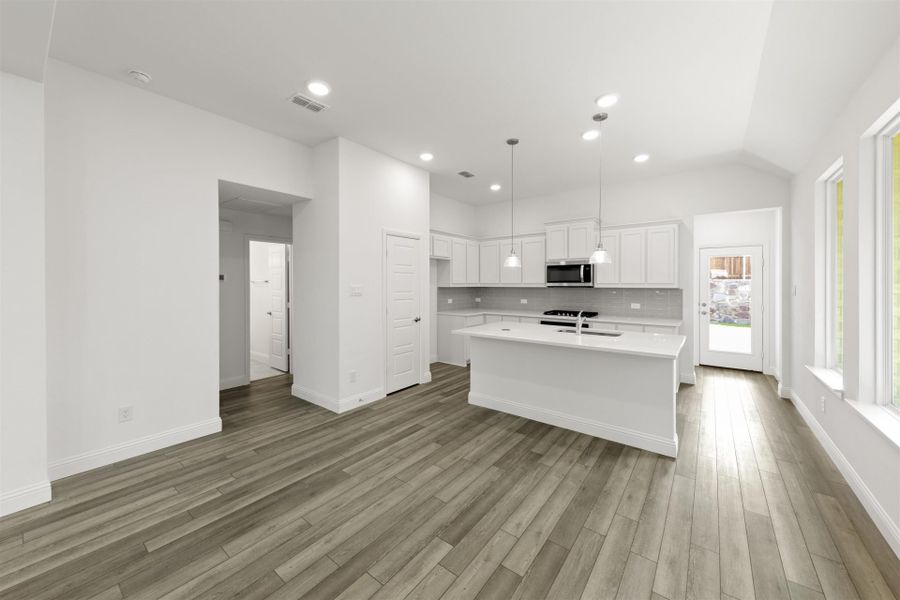 This new home at 448 Dandy Landings features the inviting Palmetto floor plan, offering 3 bedrooms and thoughtfully designed living spaces filled with modern upgrades. A versatile retreat flex space provides the perfect spot for a home office, media room, or play area, enhanced with added LED disk lighting along with the family room. The family room's soaring cathedral ceiling creates an open and airy atmosphere. The kitchen blends style and function with 36" upper cabinets, quartz countertops, a herringbone-pattern backsplash, stainless steel appliances, and elegant pendant lighting over the island. Step outside to an extended covered patio, perfect for relaxing or hosting guests year-round. Additional highlights include brushed nickel light fixtures, extra storage in the garage, and full gutters around the entire home.