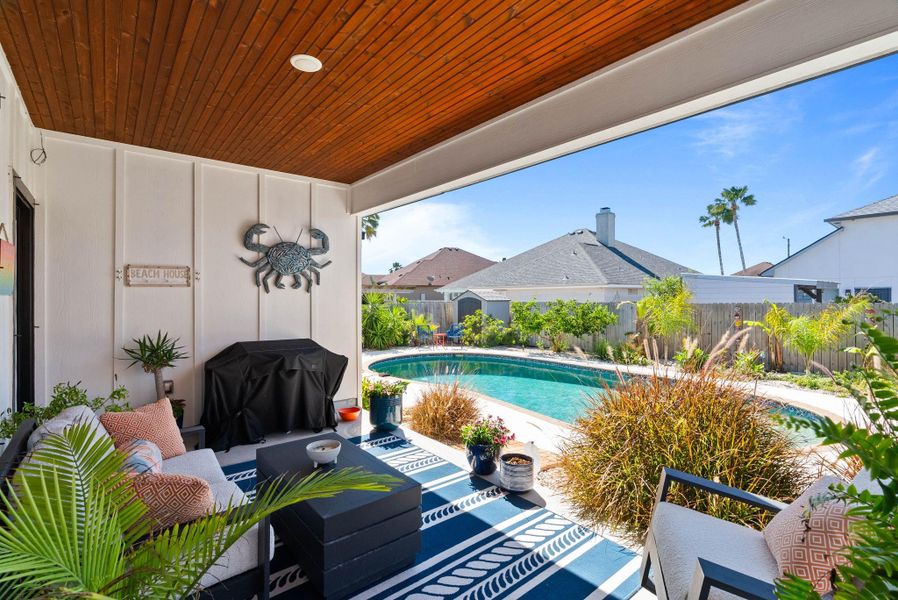 Experience refined coastal living in this stunning, thoughtfully designed Island residence, perfectly positioned on one of the most sought-after streets. Step through the entry into a light-filled, open-concept interior where elevated ceilings with exposed wood beams create a grand yet inviting atmosphere. At the heart of the home, the chef’s kitchen is a true showpiece—anchored by an oversized quartz island with seating, custom cabinetry, designer lighting, wine fridge, and a farmhouse sink. The split-bedroom design ensures privacy, with a luxurious primary suite that serves as a serene retreat. Step outside to your private resort-style oasis. The covered patio, enhanced by a warm wood-paneled ceiling, creates the perfect setting for outdoor lounging and dining. Beyond, a gas-heated saltwater pool is surrounded by lush landscaping—offering a tranquil escape or the ultimate entertaining space, with a covered cooking area or bar for all your essentials.