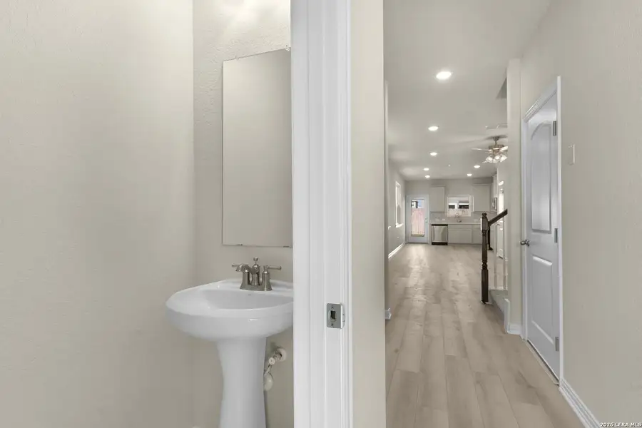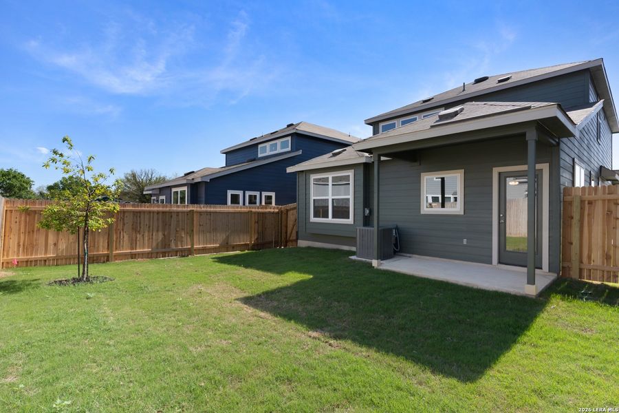 One of the final opportunities to own a brand new DRB Home in the desirable Casinas at Gruene community, this two story San Marcos plan is ideally situated on a premium corner homesite. Offering four bedrooms, two full bathrooms, and a convenient powder room, this thoughtfully designed home also includes a spacious game room for added flexibility. The unique side entry welcomes you into a bright foyer with easy access to the powder room, garage, and laundry area. The great room serves as the heart of the home and flows seamlessly into the L shaped kitchen, creating an open and inviting space perfect for everyday living and entertaining. The kitchen features electric GE stainless steel appliances, Omegastone countertops, a neutral chevron pattern mosaic tile backsplash, and a pantry for additional storage. The owner's suite is located on the main level and is privately positioned away from the secondary bedrooms. This relaxing retreat includes a charming window seat, abundant natural light, a double vanity with a Marlena top, built in linen shelving, a private water closet, and a generously sized walk in closet. Upstairs, you will find the additional bedrooms and a versatile game room, ideal for recreation or relaxation. Step outside to enjoy the covered patio, perfect for outdoor gatherings. Residents will appreciate the close proximity to a nearby lake park, as well as easy access to downtown New Braunfels, local dining, boutique shopping, and the historic Gruene district known for live music and year round events.