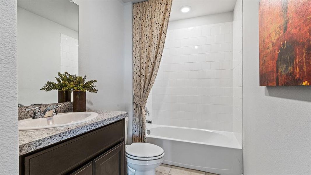 Gorgeous new D.R. Horton home in the Bella Vista community located in Granbury and Granbury ISD! The inviting two-story Ozark Floorplan, elevation C, with an estimated Summer completion, offers 4 bedrooms, 3 bathrooms, a spacious game room, and a 2-car garage, thoughtfully designed for both everyday comfort and flexible living. A welcoming front porch opens into a defined foyer, where a secondary bedroom and full bathroom are positioned near the entry, ideal for guests, multigenerational living, or a private home office. The open-concept main living area features a spacious family room that flows seamlessly into the dining area and contemporary kitchen, creating a bright and connected space perfect for entertaining and daily life. The well-appointed kitchen includes quartz countertops, 36” painted cabinets, stainless steel appliances, an electric range, stainless steel sink, center island, and a walk-in pantry for practical storage. Tucked privately at the rear of the home, the main bedroom offers a relaxing retreat with an en-suite bath featuring dual quartz vanities, a 5-foot oversized shower, and a large walk-in closet conveniently located off the bathroom. Upstairs, you’ll find two secondary bedrooms, a full bathroom with a quartz vanity top, and a generously sized game room that adds versatile space for movie nights, play, or hobbies. Luxury vinyl plank flooring enhances the main living areas and wet zones, offering durability and easy maintenance. Built with energy-efficient construction and equipped with America’s Smart Home Technology. Exterior highlights include a covered back patio, landscape package, full sprinkler system with rain sensor, and privacy fencing. Bella Vista in Granbury is more than a place to live, it’s a place to call home.