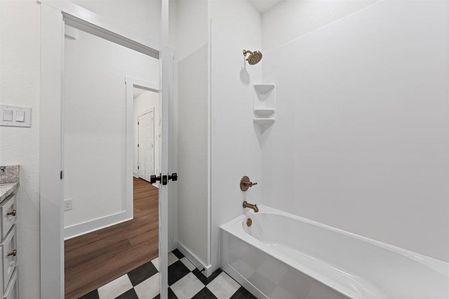 The isolated primary suite offers a private retreat with granite countertops, dual vanities, a separate tub and shower, and a walk-in closet.