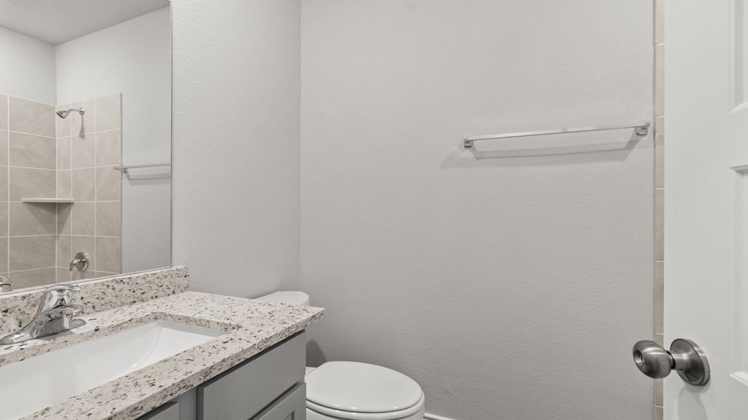 The Lakewood plan is a unique 2-story home with 5 bedrooms, 3 bathrooms, and an open-concept living, kitchen, and dining area. This floorplan features a covered patio, an oversized pantry, a dedicated breakfast room, a large family room, a dedicated laundry room, and a 2.5-car garage. The primary suite includes a walk-in closet with ample space connected to a private bathroom.