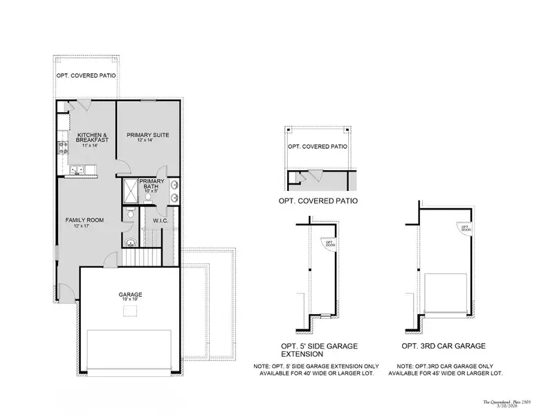 The Queensland plan is a 2-story home with 4 bedrooms, 2.5 baths, and features a 1st floor primary suite as well as a 2nd floor flex space.