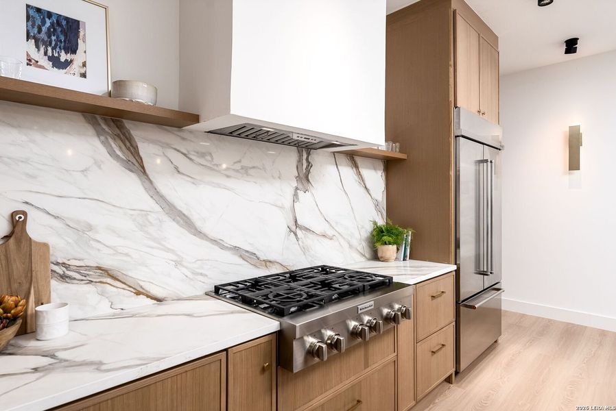 Introducing 16 Grantham Glen, a refined new construction by Nativas in the Gardens of The Dominion-designed to elevate modern living through thoughtful design and effortless elegance. One of the final opportunities to secure a homesite with a private rear-entry garage and expansive yard, this residence offers a rare blend of privacy, scale, and effortless, low-maintenance luxury. From the moment of arrival, the home captivates with its timeless facade of natural limestone and smooth stucco, anchored by a dramatic metal-and-glass pivot door that sets the tone for what lies within. Inside, a gallery-like ambiance unfolds-architectural spotlights and curated designer lighting illuminate soaring volumes and clean, intentional lines, creating a space that feels both artful and inviting. The open-concept design flows seamlessly from a striking dining space into a grand living area, where 20-foot sliding glass doors dissolve the boundary between indoors and out. This is a home designed for elevated entertaining and everyday indulgence. At its heart, the chef's kitchen is a sculptural centerpiece-featuring a tiered waterfall-edge island with integrated seating, complemented by a full suite of KitchenAid appliances, including a 6-burner gas range, built-in refrigerator, wall oven, microwave, and dishwasher. A generously sized walk-in pantry adds both convenience and discretion. Beyond the glass, a private outdoor sanctuary awaits. The covered patio, finished with elegant tile flooring, is fully equipped with an outdoor kitchen and fireplace-creating an intimate setting for evenings under the stars. The expansive yard offers ample room for a custom pool, with thoughtfully designed renderings by Keith Zars already in place, allowing for a seamless transition to resort-style living. The primary suite is a retreat of quiet luxury, featuring a spacious layout, bespoke lighting, and a spa-inspired bath complete with dual vanities and a custom-tiled walk-in shower with dual heads. Upstairs, three beautifully appointed bedrooms capture serene treetop views, alongside a generous secondary living area designed for relaxation or entertaining. One bedroom enjoys a private ensuite bath and custom closet, while the others share a thoughtfully designed bath with elevated finishes. Set within a private enclave with rear alley access and surrounded by lush, natural landscaping, this 4-bedroom, 3.5-bath residence spans approximately 3,756 square feet of meticulously crafted living space. At 16 Grantham Glen, every detail has been considered-offering a rare opportunity to experience modern luxury, architectural beauty, and the coveted lock-and-leave lifestyle within The Dominion.