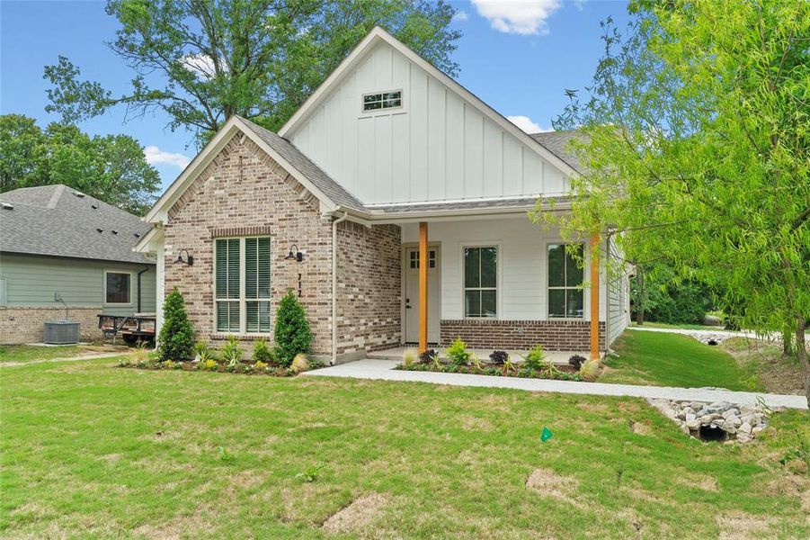 Beautiful new construction 4 bed, 2 bath and 2 car garage home with modern open-concept design. Spacious living area features vaulted ceilings with beams, electric fireplace, and custom wood accent wall. Kitchen offers large island, quartz countertops, custom cabinetry, pot filler, and stainless steel appliances, perfect for entertaining. Private primary suite includes walk-in shower and dual vanity. Additional highlights include well sized bedrooms, a mudroom with built-ins, generous storage, epoxy-coated garage, and covered patio with fenced backyard. Move-in ready!