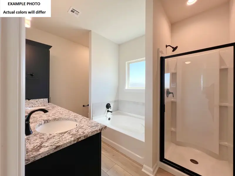 Special plan features: kitchen island overlooking the living room, spacious walk-in pantry, double vanity, garden tub, separate shower, and walk-in closet in the primary suite, covered patio, ceiling fans in the living room and primary bedroom, smart connect wi-fi thermostat, post tension slab, sodded yard with seasonal landscaping package, architectural 30-year shingles, flood lights, and more! Energy Efficient Features: a stainless kitchen appliance package, low E tilt-in windows, and more!