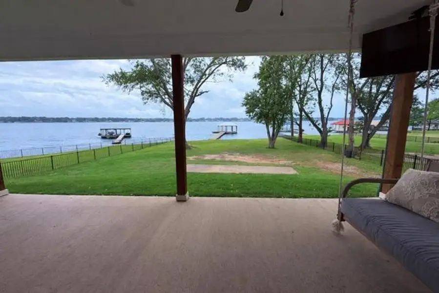 A covered back patio stretches across the home, designed for year-round enjoyment with multiple seating areas, a swing bed, and uninterrupted views of the water. Whether it’s morning coffee, game day, or sunset evenings under the fans, this space delivers.