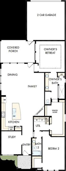 Blue Ember is designed to feel calm, airy, and quietly refined, with soft blue-gray accents layered over light flooring and crisp white cabinetry. Natural light fills the open-concept living space, creating an easy flow from the kitchen to the family and dining areas. At the center, the streamlined kitchen offers plenty of room to cook, gather, and connect, while the enclosed study provides a flexible space for work, guests, or a private retreat.