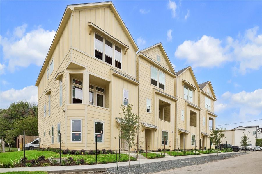 Welcome to Fowler Landing by Avalon Homes in the heart of sought after Rice Military where you'll find noteworthy dual driveway and front yard! A home with sleek design and exceptional premium finishes including an abundance of natural light, foliage views from nearly floor to ceiling windows, gleaming red oak hardwood floors, custom title work, soaring ceilings, outdoor patio balcony, and bonus office space AND flex room! You'll find handcrafted 1" shaker style soft close cabinets, Calacatta Quartz counters extended to backsplash and waterfall island detail, smart home capabilities and generously sized room. Other details include serene street, beverage bar, outdoor package closet and primary closet with custom shelving and drawers. A home with attention to detail, must-have yard, all found in an ideal location. No HOA - Check! No stucco - Check! Late July completion!