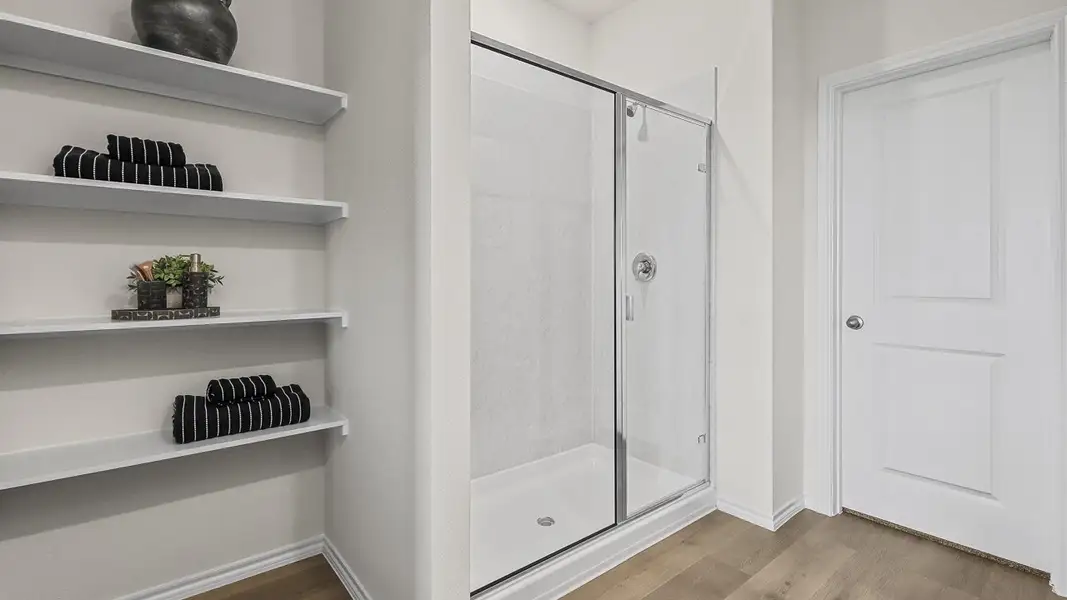 The primary bedroom, designed for relaxation, includes an adjoining bathroom that simplifies daily routines. An elongated vanity with a sink and non-framed mirror, along with a walk-in shower and closet, ensures both comfort and convenience. Laminate wood plank flooring in the living areas and plush ½” carpet in the bedrooms create a warm and inviting atmosphere.