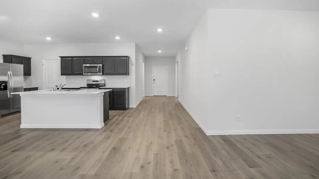 Opening the door will lead you to a foyer entry that invites you to the rest of the home. The kitchen features 30” cabinets with hidden hinges, granite or quartz countertops, and stainless-steel appliances. The kitchen layout includes a built-in sink, dishwasher and large pantry for plenty of storage space.