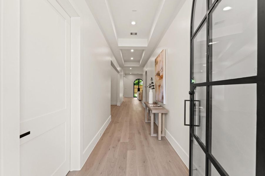 Stunning new construction in the Heights offering 4,252 sq ft of refined living with 5 beds, 5.5 baths, interiors curated for modern luxury — walking distance to Halbert Park, coffee shops and farmers market. Gourmet kitchen features inset custom white oak cabinetry, Thermador appliances, quartzite countertops, paneled 54" refrigerator and wine/beverage coolers. Formal dining and sun-lit breakfast nook complement a spacious living room anchored by a custom fireplace and built-ins. 1st floor study may serve as guest suite. A 16' slider opens to a covered patio primed for outdoor kitchen, with a pool-ready backyard perfect for entertaining. Upstairs, the grand primary suite offers a lavish bath with 72" tub, dual shower/vanities and an oversized walk-in closet connecting to the laundry room, game room and 4 beds w ensuite baths. European oak hardwoods, 11' ceilings, level 5 drywall, steel exterior doors, arched doorways, plaster finishes, elevator-ready. 5.25% rate available. Compl. July