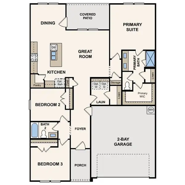 Embrace modern living in the Sutherland floor plan! This attractive plan begins with a foyer that leads past two roomy bedrooms flanking a bath. The hallway continues, opening up into a sunny, airy space centered around an inviting great room. A few steps away, a kitchen with a wraparound counter, walk-in pantry, and center island flows into a charming dining area, complete with access to the covered patio. The serene primary suite is adjacent, showcasing a large walk-in closet and a private bath with dual sinks and a walk-in shower. Enjoy comfort and convenience with the Sutherland plan!