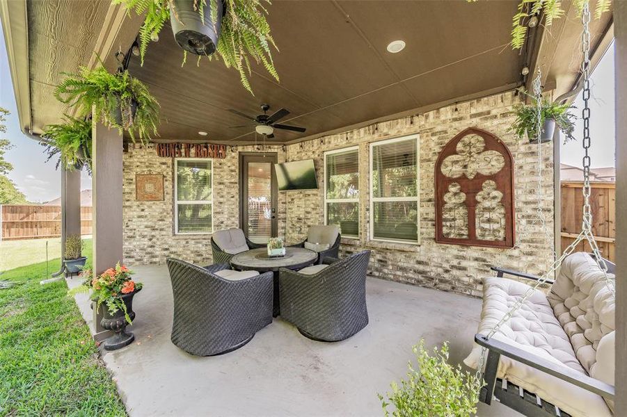 The primary suite is a true retreat with a sitting area and backyard views, complemented by a spa-inspired bath with a supersized walk-in shower, dual vanity, and an impressively large closet. Carpet is limited to bedrooms. Additional upgrades include designer lighting, window treatments, surround sound, and more—full list available in supplements. Conveniently located minutes from historic Old Town Justin.