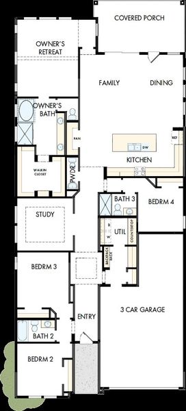 You'll be delighted by the attention to detail that makes The Azalea a sensational lifestyle home plan. Social gatherings and quiet evenings are equally enhanced with the outdoor leisure space of the deluxe covered patio. Your awe-inspiring Owner's Retreat provides a glamorous way to begin and end each day with a luxurious en suite bathroom and a wardrobe-expanding walk-in closet. Growing minds and unique decorative styles will have a superb place to call their own in the beautiful guest suite with shower and spare bedrooms. The huge kitchen features a presentation island and plenty of room for collaborative feast creation. Your open floor plan showcase 10=12' ceilings provides a beautiful expanse for you to fill with decorative flair and lifelong memories. The sunny and spacious study offers plenty of FlexSpace to craft your ideal home office, creative studio, or a family movie theater. Build your future together in this refined new home plan masterpiece.