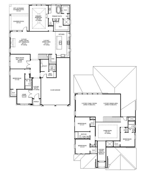 Home office and media room both with French doors frame the two-story entryway. A private guest suite is off of the main hallway and features a full bathroom. The family room and dining area connect for an open concept living space. The kitchen features an island with built-in seating and a walk-in pantry. The primary bedroom boasts three large windows. The primary bathroom has dual vanities, a garden tub, a separate glass enclosed shower, and two walk-in closets. Upstairs you are greeted by a large game room that overlooks the first floor. Secondary bedrooms featuring walk-in closets, linen closets, and full bathrooms complete the second level. Covered backyard patio. The utility room and mud room are off of the three-car garage.