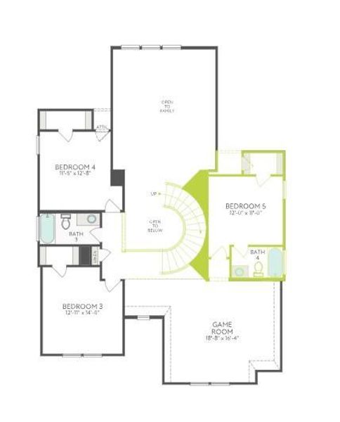 The Verdin Plan - This two-story home is designed to feel open and elevated, with the kitchen, dining area, and great room flowing together across the main living spaces while still giving each space a clear role. A dedicated study at the front of the home creates a practical everyday workspace, while the first-floor primary suite offers a more private retreat and the curved stair leads upstairs to additional bedrooms and a media room that expand the home's flexibility for movie nights, guests, or quiet downtime. The kitchen is finished with Repose Grey cabinetry, Valbella Grey quartz countertops, a classic white running-bond backsplash, Arctic Stainless fixtures, and under-cabinet lighting. The primary bath adds a freestanding tub, zinc quartz, Artsy Breccia Onyx tile, and coordinating stainless fixtures, while the bronze-accented exterior, mahogany front door, and exterior gas stub out complete the home with added polish.