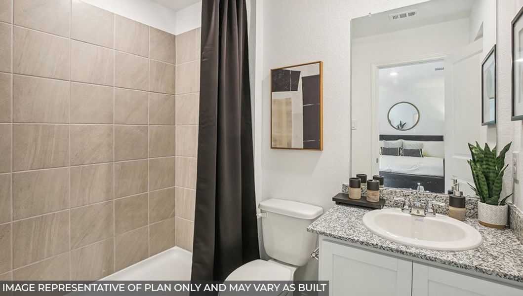Upon entering the home, you will find on one side of the entryway a secondary bedroom finished with soft carpet flooring, a tall closet, and a bright window facing the front of the house. On the other side of the entryway lies a linen closet and a secondary bathroom. The bathroom is complete with vinyl flooring and a tub/shower combo.