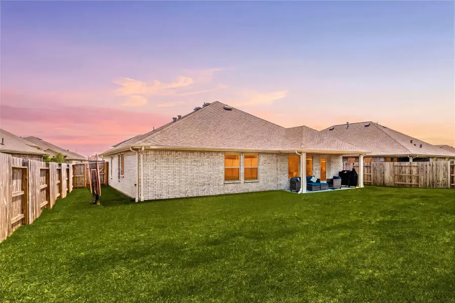 Fresh, bright & built for easy League City living! This 2024 single-story home sits in a newer community & delivers an open, airy layout w/ vinyl plank flooring through main living areas, all new ceiling fans, great natural light & seamless flow. A welcoming foyer leads into the spacious living room, while the large kitchen anchors the home w/ a center island, SS appliances, abundant cabinetry, pantry storage & open connection to the dining/breakfast area. The private primary suite features dual sinks, soaking tub, separate shower & 2 walk-in closet. Three secondary bedrooms offer flexible space for guests, office, hobbies, or playroom needs, primary walk through to laundry & 2-car garage add function. Step outside to a Texas-size backyard w/ room to garden, play, entertain, add a future pool, or create your outdoor retreat, all w/ a covered patio ready for relaxing evenings. Enjoy community park & trails near Magnolia Creek Golf Club, I-45, Tanger Outlets, shopping & dining.