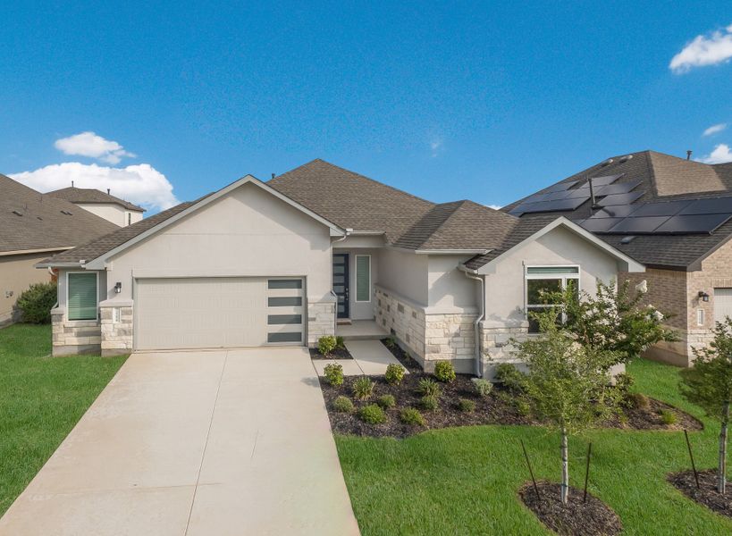 Introducing "The Driskill" by Scott Felder Homes – a single-story masterpiece boasting 4 bedrooms, 3 baths, and a 2.5 car garage. Designed for the active family, this home offers an open concept layout flooded with natural light and abundant storage space. The living room seamlessly transitions into the chef's kitchen, featuring a large island, 9 windows for natural light, a 36' gas cooktop, built-in appliances, and convenient storage solutions like a trash can pull-out cabinet and drawer banks. The master suite includes a freestanding tub, dual vanities, and a spacious walk-in closet. Relax on the covered patio and soak in the ambiance. Located in the sought-after Veramendi community, offering nearly 500 acres of parks, a pool, and exceptional amenities.