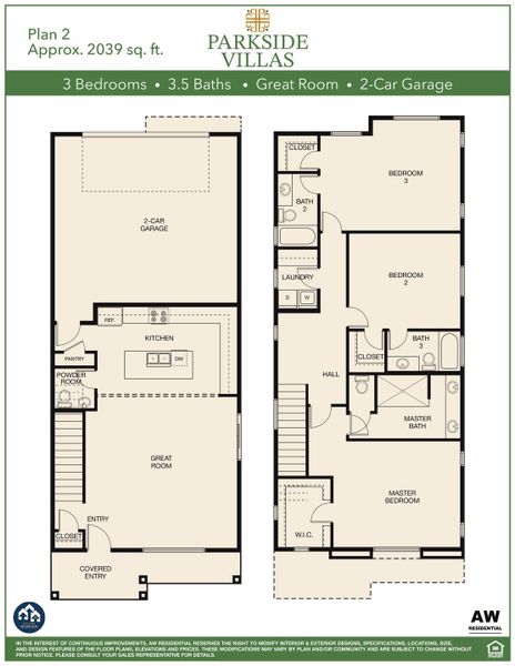 Plan 2 (2039 sq. ft.) is a home with 3 bedrooms, 3 bathrooms and 2-car garage. Features include porch, master bed upstairs and walk-in closets.
