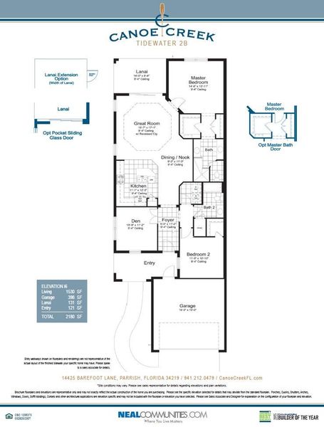 Base price does not include the homesite premium or design options. The Tidewater 2B two-bedroom, two-bath twin villa home designed by Neal Communities features a spacious layout with an open living area. The home includes an open great room, dining area and beautifully-equipped kitchen with island for enjoying five-star meals. A den offers the perfect space for a home office, while a covered lanai at the back of the home provides a lovely environment for enjoying the outdoors. The master suite bedroom includes the option of a window or door to the lanai. The suite also features two closets and a bath with dual sink vanities, walk-in shower and private water closet. A walk-in closet and proximity to a full bath makes the second bedroom a great guest room. Visit our Canoe Creek community and tour the model homes. Call today for more information and to schedule an appointment. Our villa homes sales office can be found at 14425 Barefoot Lanes. Directions here