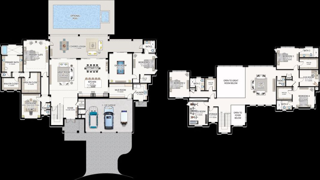 - Flex RoomKitchenDen RoomGame RoomMudroomDining RoomFamily RoomOpen Concept FloorplanPrimary Bedroom Downstairs