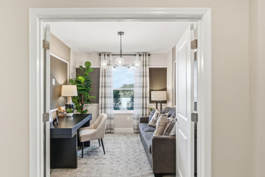 Enter into a grand foyer with stairs leading up one side of the wall, and a powder room on the other. As you walk through the foyer and down the hall, a laundry room sits off to the side with an optional drop zone, creating a seamless transition for the days when you’re running out the door. A flex room sits on the opposite side as well, giving you the option to turn it into a cozy den.